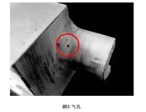 砂眼是鑄造閥門的表面常見的缺陷,主要出現(xiàn)在閥門外表面,砂眼內(nèi)部有砂或白色的渣,外形不規(guī)整,深淺不一。氣孔一般出現(xiàn)在鑄造閥門的內(nèi)部、表面或近于表面處,表面比較光滑,呈圓形或橢圓形,有時孤立存在,有時簇集在一起,常與夾渣或縮松并存(圖3所示)。如果是反應性氣孔,通常不大,在鑄件表面或鑄件表面以下不太深的地方,如果是侵入性氣孔,面積稍大,常呈圓形、橢圓形或針孔狀。