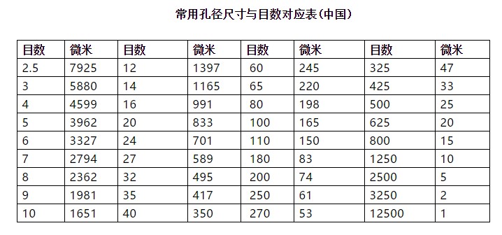 目數,就是孔數,就是每平方英寸上的孔數目。目數越大,孔徑越小。一般來說,目數×孔徑(微米數)=15000。比如,400目的篩網的孔徑為38微米左右;500目的篩網的孔徑是30微米左右。